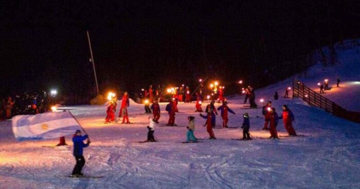 La tradicional bajada de antorchas protagonizada por esquiadores expertos desde la cumbre del cerro Krund, dentro del complejo de esquí «Cerro Castor»,
