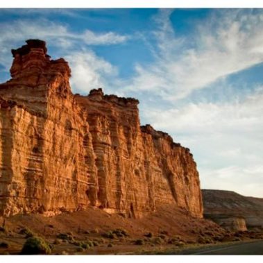 El paisaje está marcado por las imponentes mesetas del Valle de Los Altares y el cauce del Río Chubut.