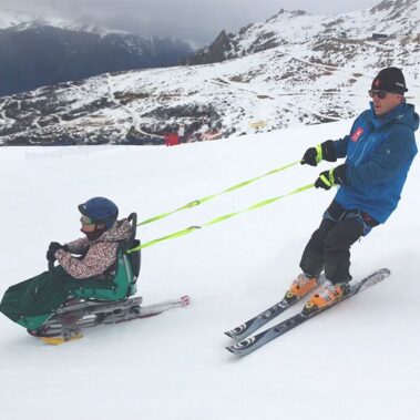 La silla “bi esquí”, por su parte, tiene dos esquíes y mayor estabilidad; sin embargo, requiere mayor asistencia, y está pensada para personas que tienen menor equilibrio y capacidad de movimiento de sus brazos.